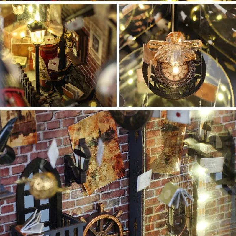 Step into a world full of wonder and illusions with our Fantasy Train Platform Book Nook. This artful miniature diorama transforms your bookshelf into a mysterious steampunk portal, revealing an endlessly extending platform scene. Through a clever optical reflection principle, a magical depth effect is created that transports the viewer to a long-past era where steam and candlelight set the atmosphere. It is a masterpiece of miniature art that bridges reality and fantasy with its delicate reproduction of brick textures and nostalgic elements.