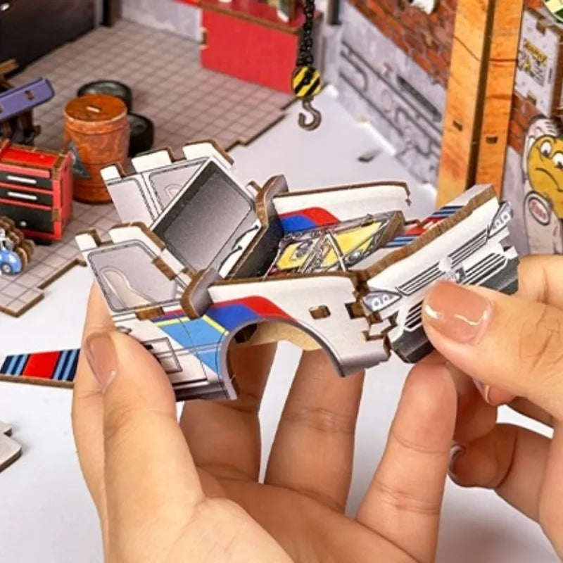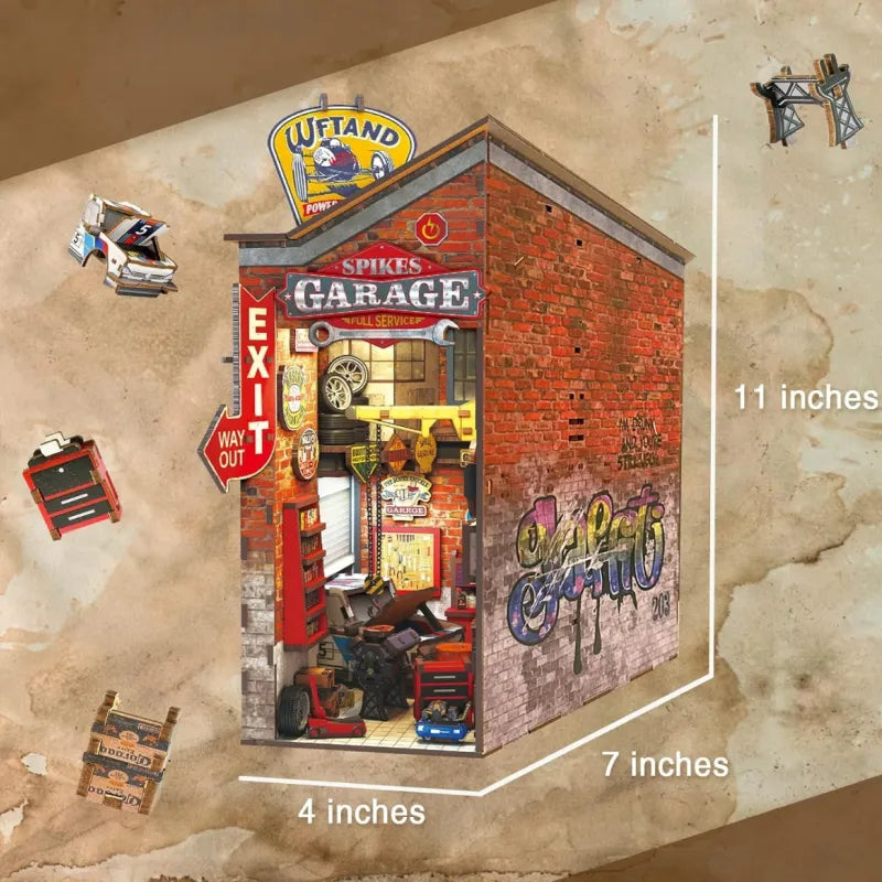 Book Nook - Garage is a detailed DIY miniature model in an industrial style, perfect for car enthusiasts and tech fans. With a crane, workbench, tool wall, and much more, it creates a realistic workshop scene. A unique gift and at the same time a decorative highlight for any bookshelf.