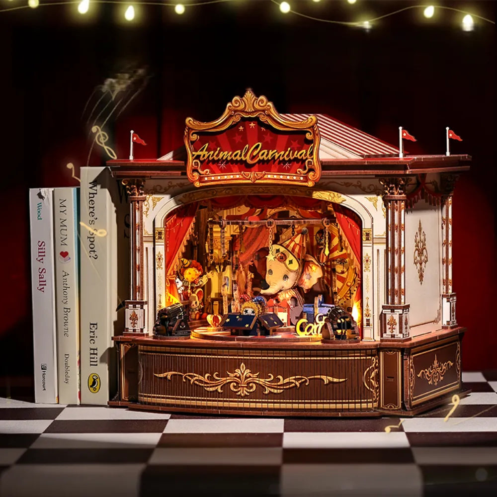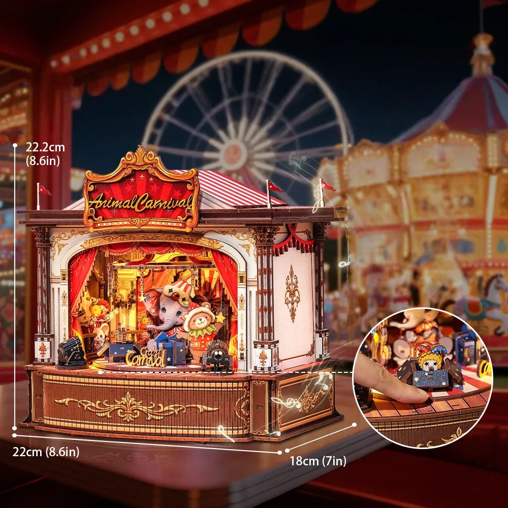 Este elaborado rompecabezas 3D de madera se convierte en una encantadora caja de música que trae la alegre atmósfera de una feria directamente a su hogar. Cree un escenario en miniatura iluminado donde adorables animales actúan al son de una hermosa melodía y despiertan recuerdos despreocupados de la infancia.